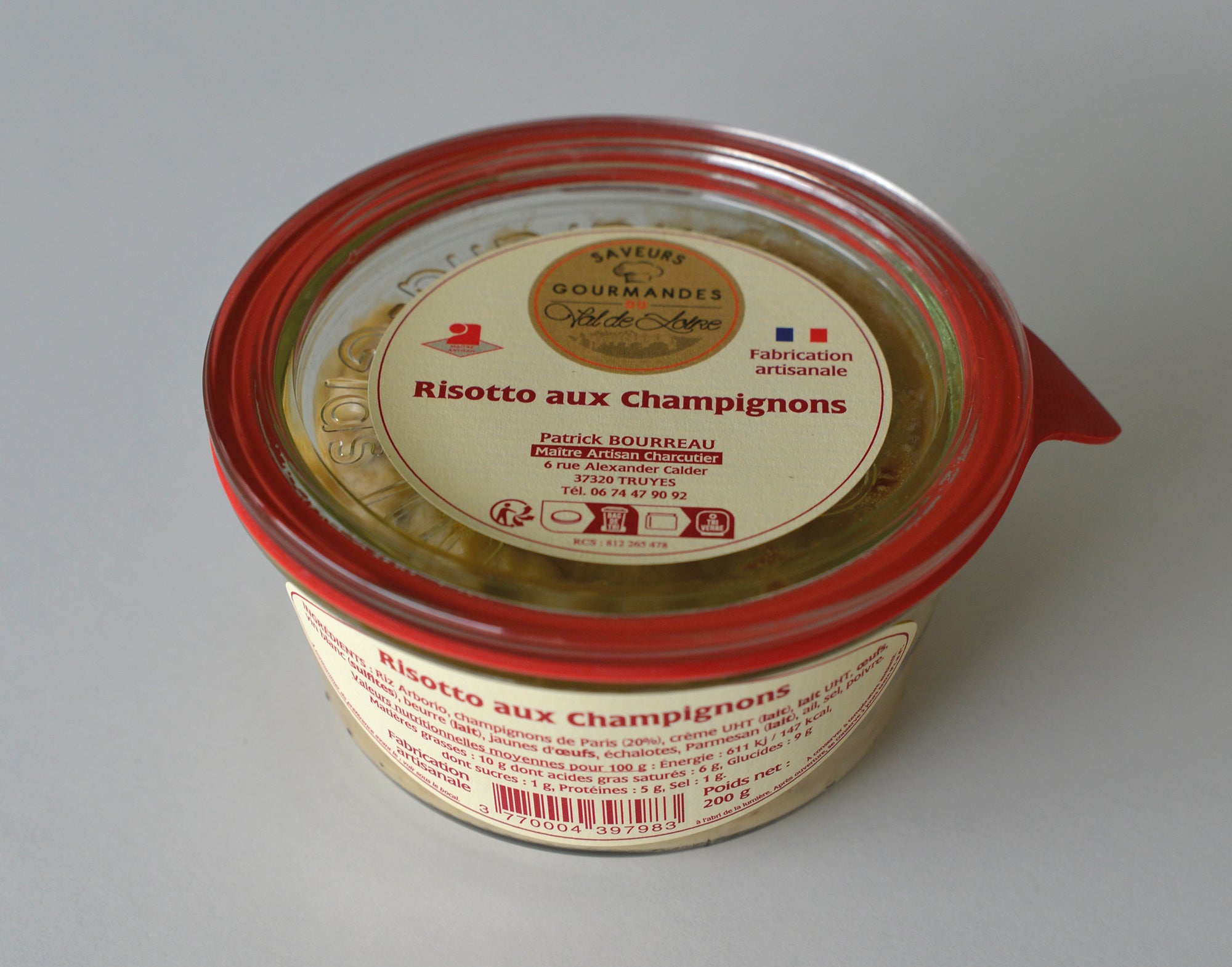 Riz Arborio, champignons de Paris (20%), crème UHT (lait), lait UHT, œufs, vin blanc (sulfites), beurre (lait), jaunes d’œufs, échalotes, Parmesan (lait), ail, sel, poivre.