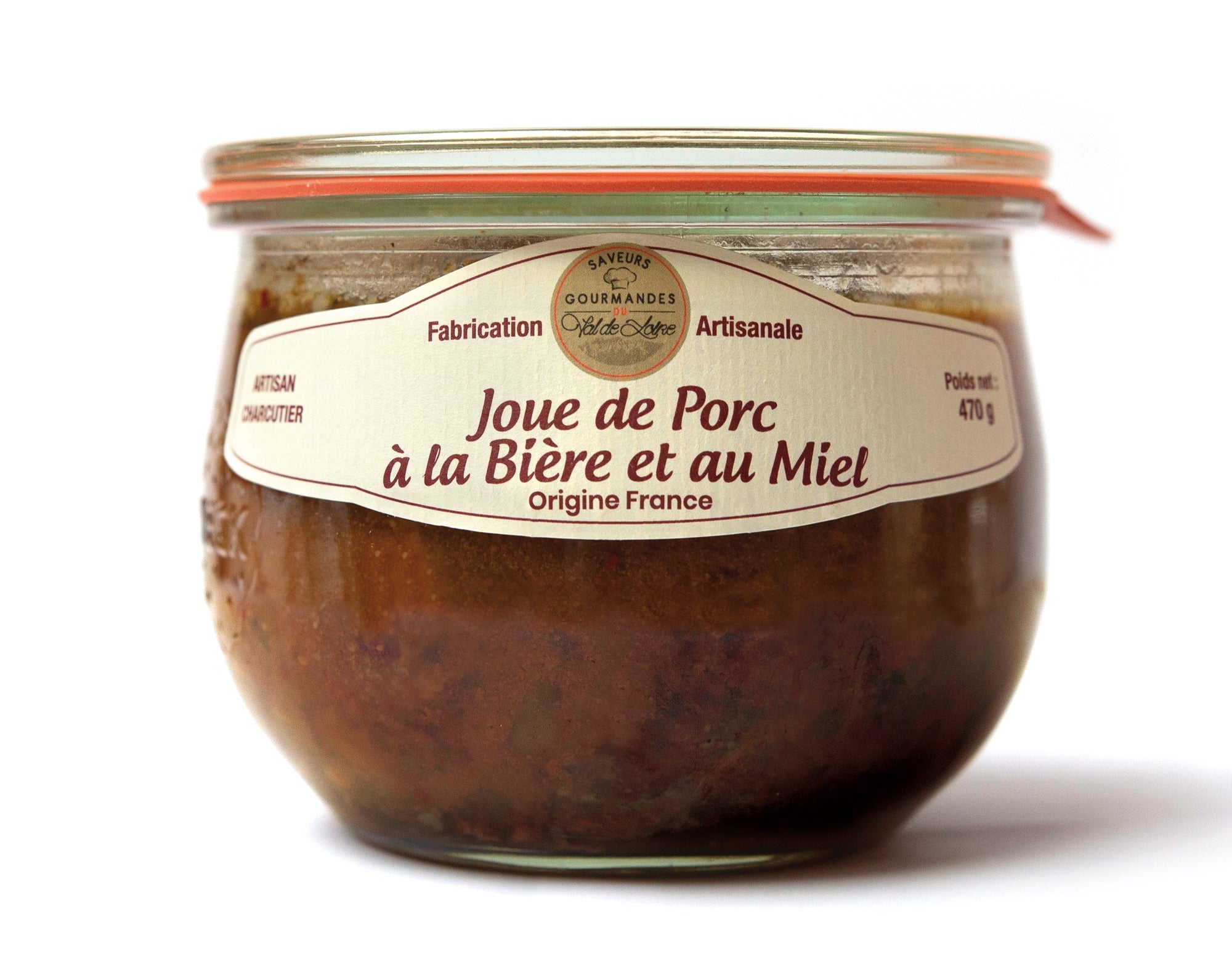 Joue de porc ((60%) ORIGINE FRANCE), oignons, miel de Touraine (5%), bière ((5%), eau, malt d’orge et de blé, houblon, épices, levures, arômes naturels), huile d’olives, ail, fécule de pomme de terre, sel, poivre.