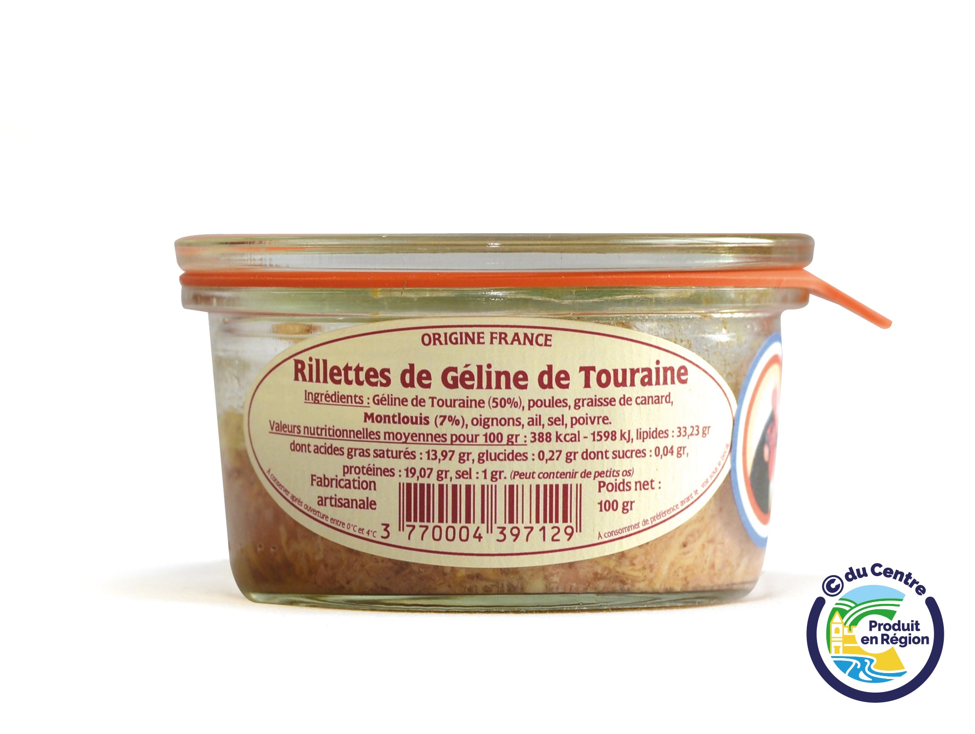 Géline de Touraine (40%), viande de poule, graisse de canard, Montlouis (7%), oignons, ail, sel, poivre. (Peut contenir de petits os)
